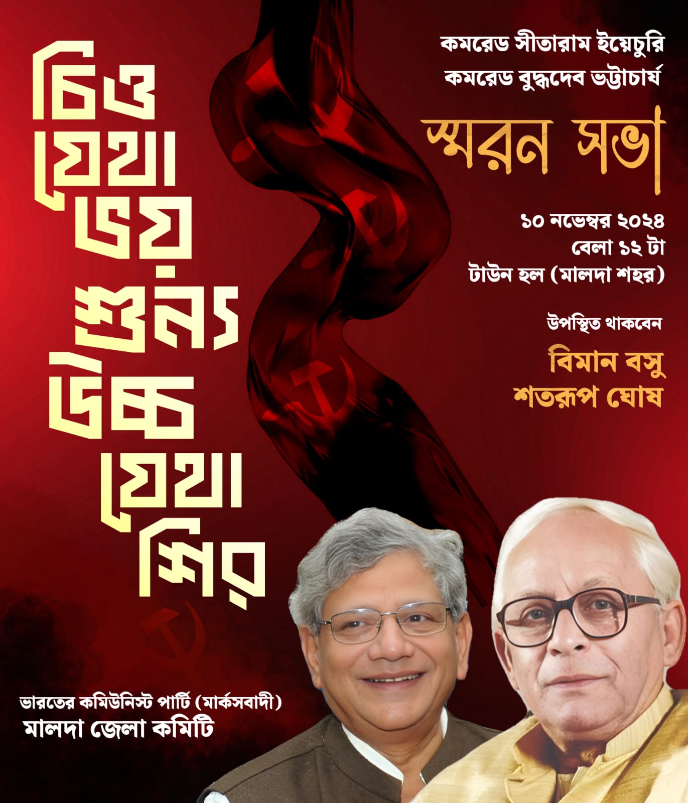 নিজস্ব সংবাদদাতা, মালদা:- মালদা জেলা বামফ্রন্টের উদ্যোগে প্রয়াত কমরেড সিতারাম ইয়েচুরি এবং প্রয়াত কমরেড বুদ্ধদেব ভট্টাচার্যের সরন সভা অনুষ্ঠিত হলো…