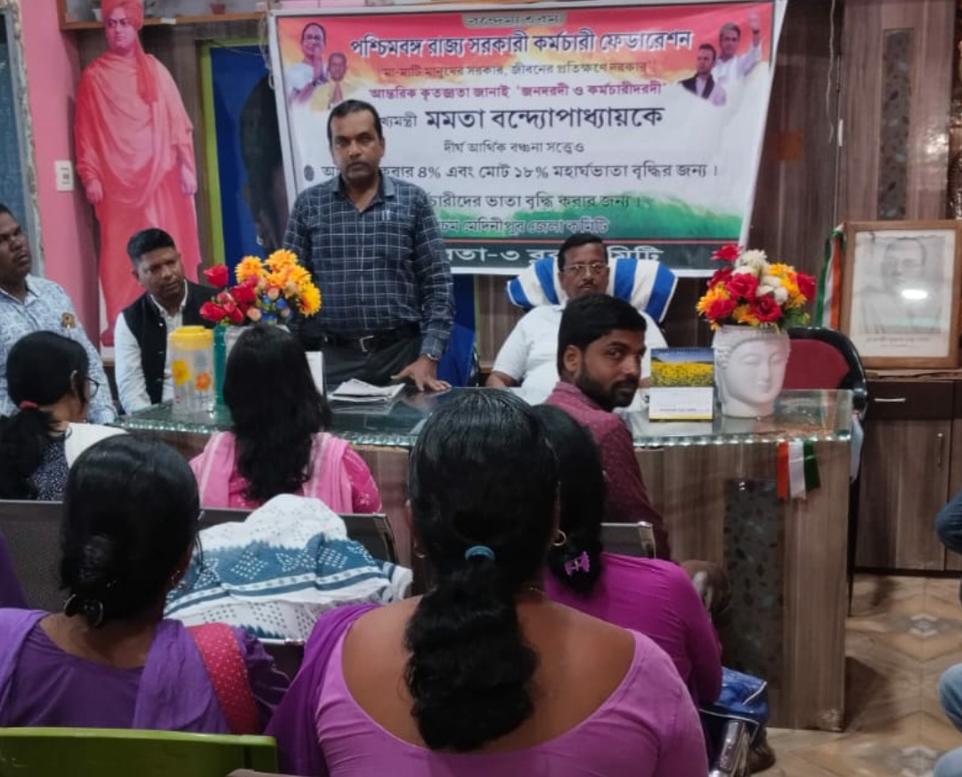 পশ্চিম মেদিনীপুর, নিজস্ব সংবাদদাতাঃ- চলতি বছরের রাজ্যের বাজেটে ৪% এবং ১৮% মহার্ঘ ভাতাবিদ্ধি এবং চুক্তিভিত্তিক কর্মচারীদের ভাতা বৃদ্ধির ঘোষণা করেছে…
